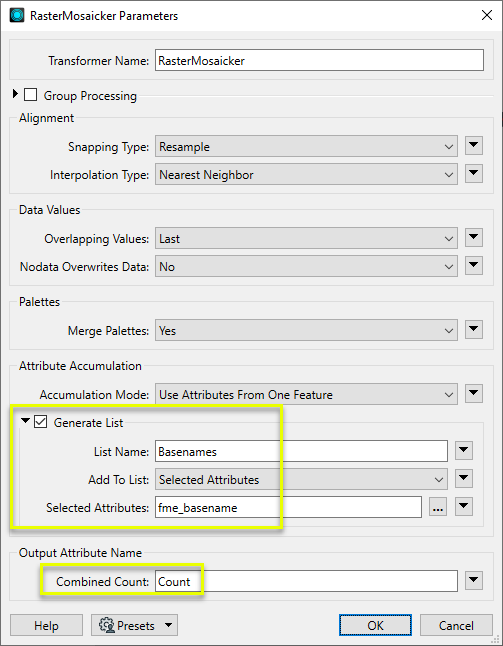 The default settings will provide the desired results. We will also add a Combined Count attribute - Count - to track how many images have gone into the mosaicked image, and create a list attribute called Basenames which will contain the name of each source image.