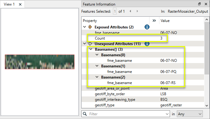 One single raster feature is output. In the FME Data Inspector, we can see the new list attribute and count, indicating that three rasters went into the mosaic, and what their names were.