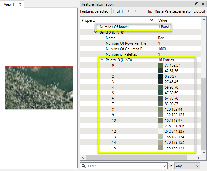 - The input raster feature must have the correct number of bands selected, in the correct order, and of the correct interpretation type. The RasterSelector, RasterBandOrderer and RasterBandInterpretationCoercer may be used if necessary, prior to the RasterPaletteGenerator, to meet these requirements.