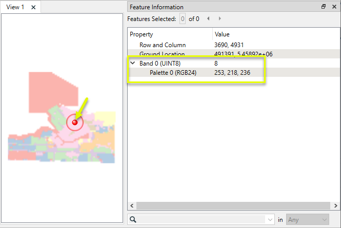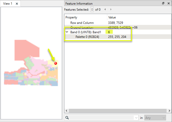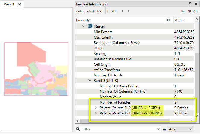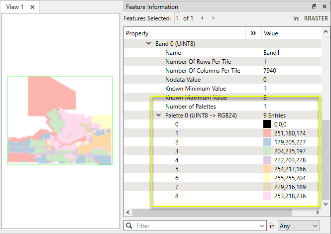 In this example, we start with a single-band raster that has two palettes - one containing RGB colors, and one containing string descriptions. We want to remove the string palette. Note the band and palette numbers - they will be needed to select the correct palette for removal.