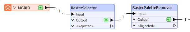 The raster is routed first into a RasterSelector, where we will select the palette to be removed. From there, it is passed through the RasterPaletteRemover.
