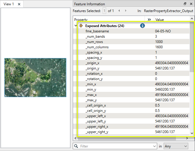 In this example, we will extract the geometry properties of an orthoimage. Note that the source raster feature has 13 typical attributes. Some geometry properties can be seen in the Feature Information window of the FME Data Inspector (under IFMERaster), but are not exposed in a usable attribute form.