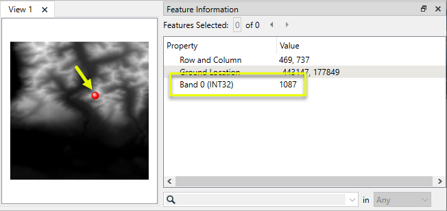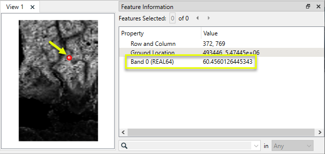 The output raster feature has new Band 0 values - the calculated slope - and the band has been converted to a floating-point decimal interpretation type (real64).