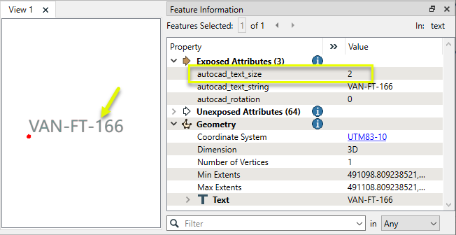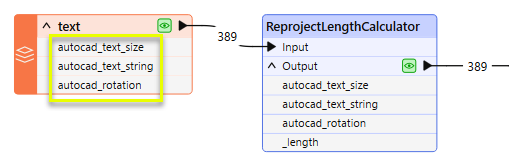 Note that three format-specific attributes have been exposed - autocad_text_size, autocad_text_string, and autocad_rotation. This was done in the Autodesk AutoCAD DWG/DXF Reader parameters, Format Attributes, so that we can access their values.