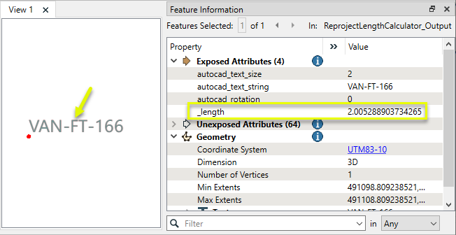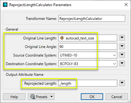 - To calculate the reprojected length of a feature with line geometry, consider using a Reprojector (or other reprojection transformer) and LengthCalculator.
