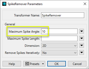 The feature is routed into a SpikeRemover. In the parameters dialog, Maximum Spike Angle is set to 10 degrees.