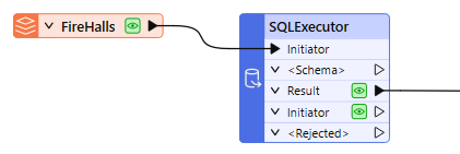 The FireHalls datasets is connected to the Initiator port on a SQLExecutor. Each FireHalls feature will cause the SQL query to be executed, for that feature.