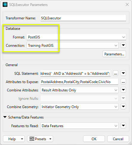 - Features that enter this transformer are not output until the SQL query completes. This behavior ensures that additional SQLExecutor transformers, if present, do not execute their queries until the previous query completes.