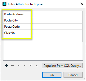 Enter the names of attributes to expose on the features created by the query. The attributes will be output in the same sequence as specified in the list. Note By default, the attributes of the resulting features are hidden. Specify which attributes to expose by entering the attribute names. Click the browse button next to the Attributes to Expose parameter. You can also use a SQL statement to populate the list by pressing “Populate from SQL Query…” and entering a SQL query. The columns from the first matching feature will be used to populate the attributes list.