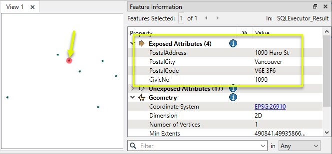 The features with query results are output via the Results port, and have new attributes added by the SQL statement.