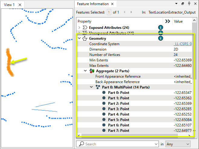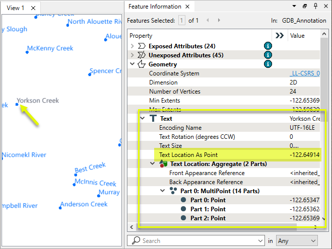 Note that in addition to the Text Location as Point coordinates, the selected feature also has aggregate multipoint geometry stored.