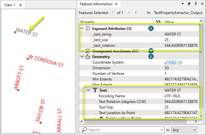 The output features have new attributes, containing the text string, size, and rotation of the labels. The text geometry remains unchanged.