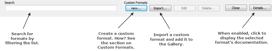 The Formats Gallery displays all formats supported by FME. It includes the following information: