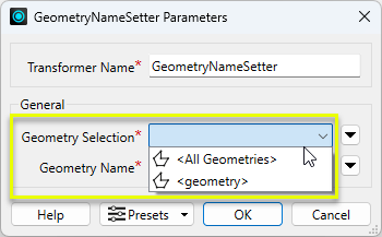 Geometry names exposed by this transformer are visible in downstream schema-aware drop-downs in transformers such as the Reprojector, GeometryRemover, and GeometryNameSetter. They are treated as if they exist in the feature schema, even if they don’t yet exist in the data.
