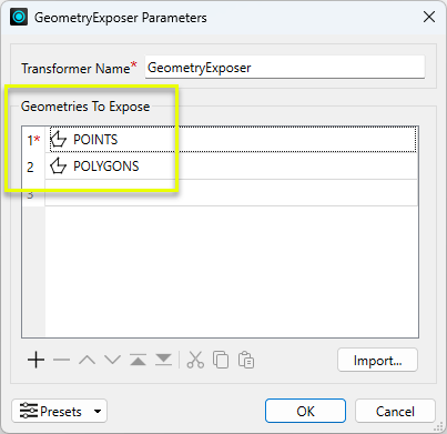 Provide geometry names to expose. The order in which they appear here is the order in which they will appear in the Output port. Use Import to read names from any upstream feature cache. |