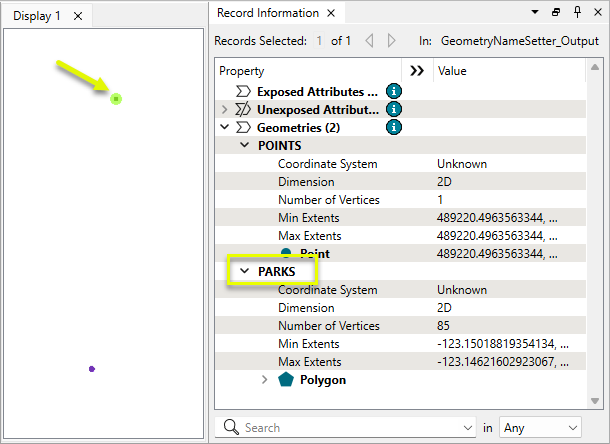 In this example, we have a set of features with multi geometry. Note that two geometries exist on the feature, and are named POLYGONS and POINTS. We want to rename them to something meaningful.